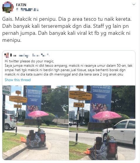“Boleh dikatakan, hampir setiap hari saya akan terserempak dengan makcik tersebut. Saya juga sebelum ini pernah memberi wang kerana ‘terpedaya’ dengan cerita sedihnya. Bagaimanapun, kisah makcik itu terbongkar selepas beberapa individu pada tahun lalu membuat pendedahan di Facebook,” kata Fatin kepada mStar.