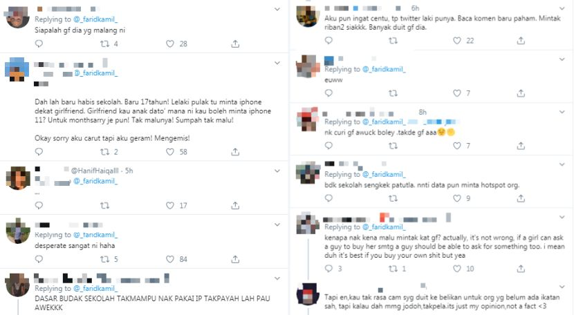 "Dah lah baru habis sekolah. Baru 17 tahun. Lelaki pulak tu minta iPhone dekat girlfriend. Girlfriend kau anak datuk mana ni kau boleh minta iphone 11? Untuk monthsary je pun. Tak malunya. Sumpah tak malu. Okay sorry aku carut tapi aku geram. Mengemis," tulis beberapa netizen.