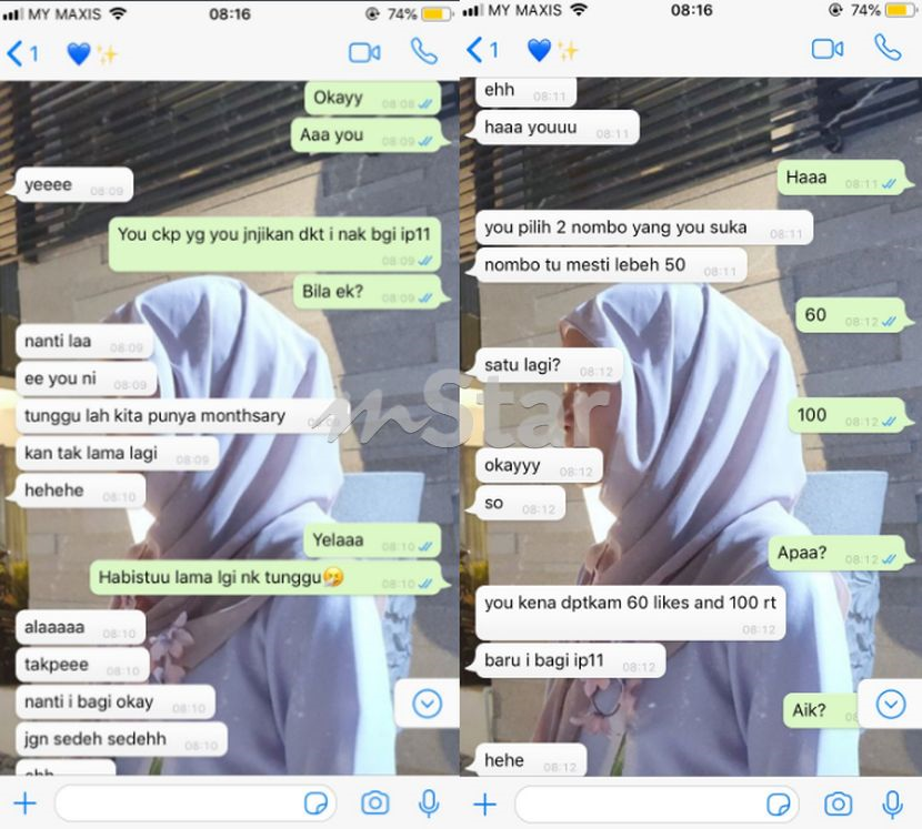 Ketika berkongsi perkara itu kepada mStar, remaja lelaki tersebut, Mohd Farid Kamil berkata, permintaan untuk mendapatkan telefon pintar baharu iPhone11 daripada pasangannya bersempena genap 30 hari mereka bercinta.