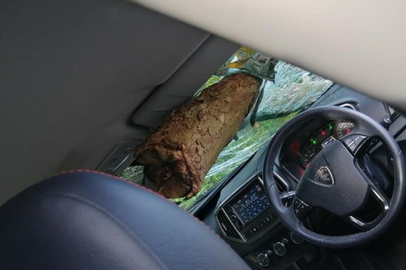 Seorang lelaki mengalami pengalaman ngeri apabila sebatang dahan pokok yang patah menembusi cermin keretanya. Fofo: FB Mohd Saiful Rusdy Rozlan.