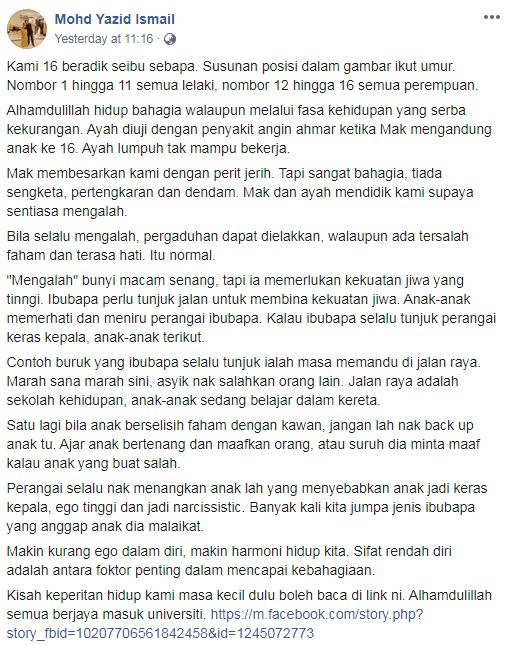 “KAMI pernah jamah nasi campur air, garam dan sedikit gula,” demikian perkongsian seorang lelaki yang menceritakan keperitan hidupnya yang membesar bersama 15 adik beradik lain suatu ketika dahulu. Berkongsi cerita bersama mStar, Mohd Yazid Ismail yang merupakan anak ke-11 daripada 16 beradik seibu sebapa itu berkata, sejak kecil lagi dia dan adik beradiknya bekerja bagi membantu kedua orang tua mereka. “Ayah pada ketika itu imam di sebuah masjid di Kota Bharu, Kelantan yang mendapat elaun sebanyak RM400 sebulan. Dengan duit itulah dia membesarkan anak-anak. Pada masa sama, kebetulan ayah ada memajak tanah, jadi di tanah tersebut ayah dan mak tanam pelbagai jenis sayur-sayuran. ARTIKEL BERKAITAN: Tiada zuriat bukan alasan kahwin lain! Hampir 20 tahun baru dapat anak, tapi layanan tetap sama - “Sampai meninggal ayah tak tahu saya dah tahu” ARTIKEL BERKAITAN: Kakak cari adik dan ayah... hanya ‘berbekalkan’ nama Abdullah - “Kami sikit pun tak pernah dicium, dibelai oleh ibu bapa kandung” “Abang-abang akan keliling kampung menjual hasil tanaman kami untuk mendapatkan pendapatan sampingan. Hasil kebun sayur juga dihantar ke pasar. Dengan pendapatan yang tidak seberapa itulah, mak dan ayah membesarkan kesemua anak-anak mereka,” katanya yang kini berusia 35 tahun. Menurut Mohd Yazid, daripada 16 adik beradiknya itu, 11 adalah lelaki dan lima lagi perempuan. Adik beradik Mohd Yazid bergambar bersama ibu mereka, Fatimah Jusoh. Cerita Mohd Yazid, kesusahan keluarga mereka makin berganda apabila ayah kesayangan, Ismail Abdullah diserang strok ketika berada di masjid, hingga mengakibatkan lumpuh separuh badan. Ketika itu ibunya, Fatimah Jusoh yang kini berusia 69, sedang mengandungkan adik bongsunya. “Kejadian itu berlaku pada 1991, ketika itu saya baru Darjah 2. Dengan keadaan ayah yang lumpuh, dia hanya terlantar. Bermakna hilang sumber pendapatan. Tiada simpanan sebab hidup cukup-cukup makan saja. Alhamdulillah pihak masjid bagi wang ehsan setiap bulan RM150. “Dengan wang itu, berserta meniaga sayur, mak besarkan kami dan dalam masa yang sama uruskan ayah. Tak pernah mak merungut. Walaupun serba kesempitan, Allah kurniakan rezeki yang cukup. “Allah bagi rezeki kepada anak-anak dalam bentuk kesedaran untuk berdikari. Walaupun masih di sekolah rendah, kami dah mula cari duit sendiri. Jadi buruh sementara, kutip botol dan tin aluminium untuk dijual, bercucuk tanam dan lain-lain. Saya sendiri pernah bekerja mengutip tahi ayam di sebuah perusahaan penternakan ayam dengan upah 50 sen seguni,” ujarnya. Mohd Yazid yang merupakan anak ke-11 kini bekerja sebagai pengurus agensi di syarikat pengurusan kewangan dan pelaburan. Tambah Mohd Yazid, ketika itu hanya abang sulungnya sahaja yang sudah bekerja manakala adik beradik lain masih lagi belajar. “Alhamdulillah, abang sulung ketika itu bekerja sebagai pegawai askar, manakala abang-abang yang lain pula dapat biasiswa. Malah, dengan duit biasiswa itu mereka hulur pada mak untuk tampung perbelanjaan persekolahan adik-adik. Pernah abang saya cerita, dia sanggup ikat perut semata-mata untuk hantar duit ke kampung. “Sungguhpun serba kekurangan, mak tidak akan berhutang. Kami masih menggunakan dapur api kayu untuk memasak sehingga 2001 bagi untuk berjimat,” katanya yang kini bekerja sebagai pengurus agensi di syarikat pengurusan kewangan dan pelaburan. Menurut Mohd Yazid, ditakdirkan ayahnya menghembuskan nafas terakhir pada 2000 selepas lapan tahun terlantar akibat strok. Perkongsian Mohd Yazid mengenai kisah keluarganya meraih sehingga melebihi 3,000 shares. “Ayah memang seorang yang sangat tegas. Semasa ayah masih hidup dan sihat, dia tidak pernah bertanya tentang pencapaian pelajaran anak-anak, tapi ayah selalu tanya tentang solat di masjid atau tak. Arwah ayah memang menekankan pendidikan agama. “Dan sebab itulah, walaupun kami ramai tetapi tidak pernah bersengketa apatah lagi berebut harta pusaka. Kalau salah faham, itu memang biasa cuma tidak pernah ke tahap bermasam muka,” ceritanya. Hasil didikan kedua orang tuanya, menurut Mohd Yazid, kesemua adik beradiknya berjaya melanjutkan pelajaran hingga ke menara gading. Allah bagi rezeki kepada anak-anak dalam bentuk kesedaran untuk berdikari. Walaupun masih di sekolah rendah, kami dah mula cari duit sendiri. Jadi buruh sementara, kutip botol dan tin aluminium untuk dijual, bercucuk tanam dan lain-lain. Saya sendiri pernah bekerja mengutip tahi ayam di sebuah perusahaan penternakan ayam dengan upah 50 sen seguni. MOHD YAZID ISMAIL “Seramai 16 semuanya dan tujuh berkhidmat sebagai pendidik, manakala yang lain ada yang berniaga, seorang abang bergelar hakim di Mahkamah Shah Alam, dan ada yang menjadi penceramah motivasi. “Kini keluarga kami bertambah besar dengan kehadiran 63 cucu. Apabila balik beraya di Kota Bharu, memang kereta tak muat nak parking di halaman rumah,” ujarnya ketawa kecil. Ditanya apa resepi bahagia keluarga besarnya, kata Mohd Yazid, segala-galanya bertitik tolak daripada hasil didikan kedua orang tuanya yang amat menekankan soal agama. “Untuk hidup aman dan bahagia, kena terapkan pendidikan agama dan dari situ akan terjaga akhlak. Kalau diikutkan, arwah ayah ada meninggalkan tanah pusaka, tapi kami adik beradik memilih untuk bertolak ansur. “Tanah diberikan sebahagian kepada mana-mana di antara kami yang lebih memerlukan, manakala sebahagian yang lain diberi kepada mak. Sikap bertolak ansur ini memudahkan urusan pembahagian harta. Sikap tamak tidak akan membawa kita ke mana-mana,” ujarnya mengakhiri bicara.
