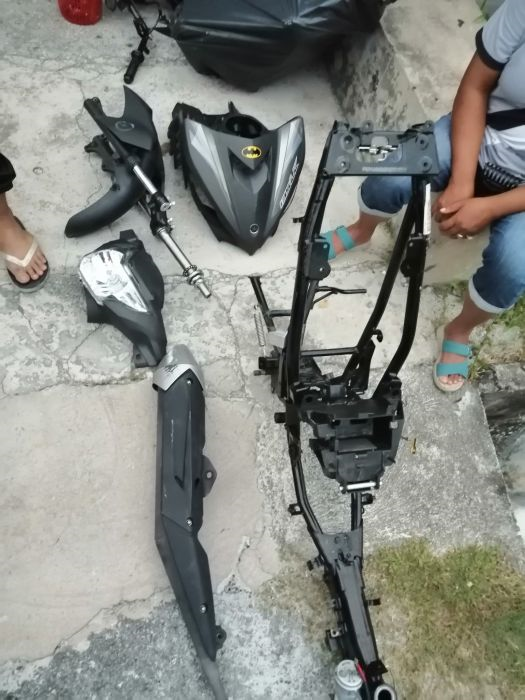 Komponen motosikal Aqim yang sudah dileraikan untuk dijual.