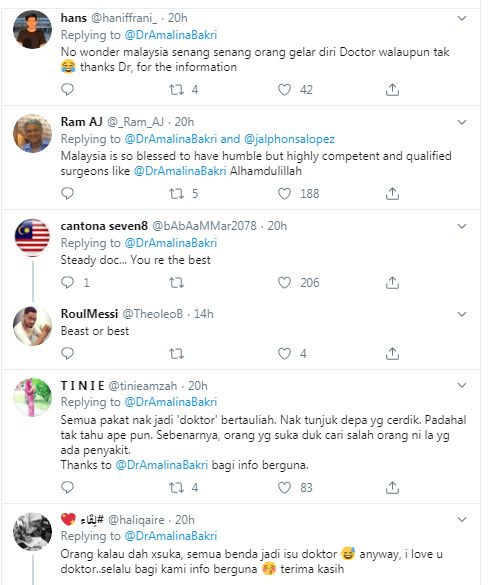 “Malaysia beruntung mempunyai pakar bedah yang bukan sahaja rendah diri, malah berkepakaran dan berkelayakan tinggi seperti @DrAmalinaBakri. Alhamdulillah,” komen seorang pelayar yang lain pula.