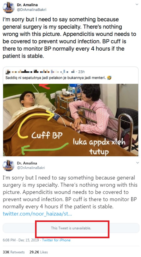 Posting Dr Amalina yang memberi respon terhadap tweet seorang netizen (atas), yang mana kemudiannya dipadam oleh individu berkenaan (bawah).