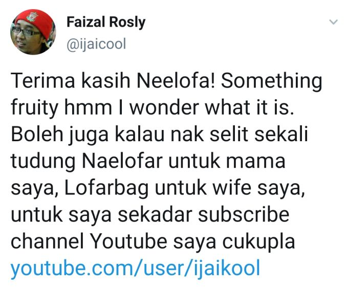 “Terima kasih Neelofa! Something fruity hmm I wonder what it is. Boleh juga kalau nak selit sekali tudung Naelofar untuk mama saya, Lofarbag untuk isteri saya, untuk saya sekadar langgan saluran YouTube saya cukuplah,” ujarnya ringkas.