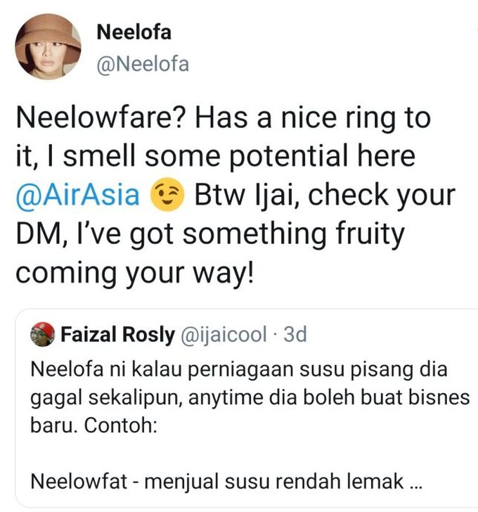 “Neelowfare? Has a nice ring to it, I smell some potential here @AirAsia. By the way Ijai, check your DM, I’ve got something fruity coming your way!” balas Neelofa di laman sosial.