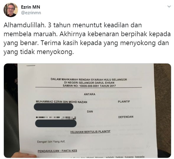 "Rasa lega selepas tiga tahun berjuang dan habis masa serta wang untuk turun naik mahkamah. Paling penting saya bersyukur sangat apabila kes ini selesai.