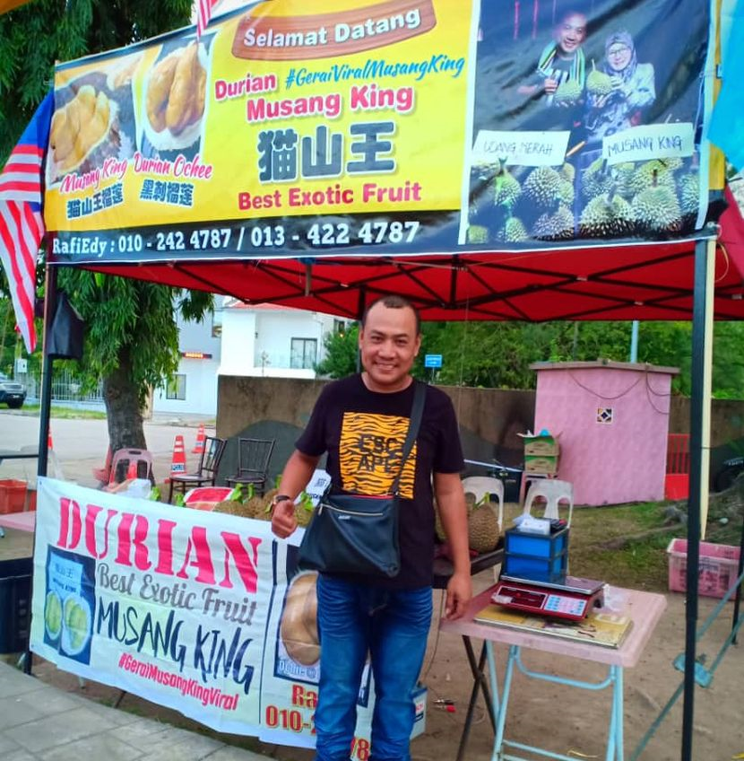 Mohd Rafi yang berniaga raja buah itu lebih empat tahun lalu memberitahu, antara persiapan yang dibuat di gerainya adalah dengan meletakkan kain rentang baharu memaparkan gambarnya bersama Tunku Azizah bersama durian.