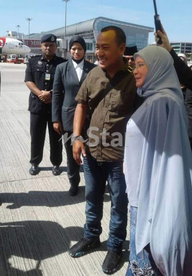(kiri) Mohd Rafi berpeluang bertemu dengan Tunku Azizah di lapangan terbang. (kanan) Mohd Rafi menunjukkan kain rentang yang memaparkan fotonya bersama Tunku Azizah yang berkunjung ke gerainya sebelum ini. Foto ihsan Mohd Rafi Yakob