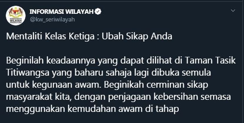 "Walhal, tong sampah telah disediakan di setiap sudut di taman awam tersebut untuk kemudahan orang ramai menjaga kebersihan. Tetapi beginikah rakyat Malaysia, hanya mampu berada di tahap minda kelas ketiga," demikian tulis pengendali Twitter itu.