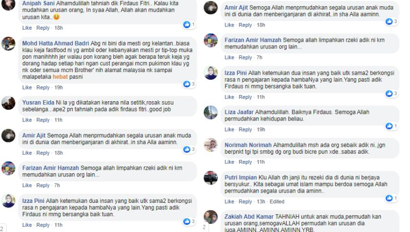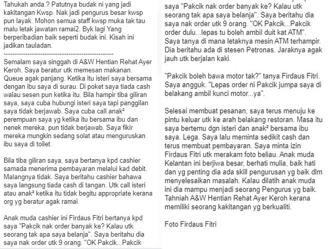 “Anak muda cashier ini (bernama) Firdaus Fitri bertanya kepada saya pakcik nak order banyak ke? Kalau untuk seorang, tak apa saya belanja. Saya beritahu dia saya nak order untuk sembilan orang,” ujarnya.
