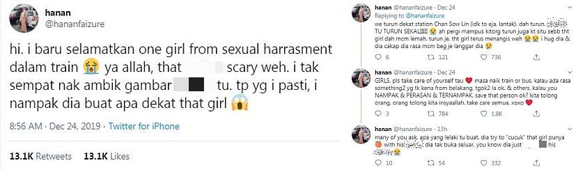 Perkongsian Hanan tular di media sosial apabila dia menyelamatkan seorang gadis yang dicabul di dalam pengangkutan awam.
