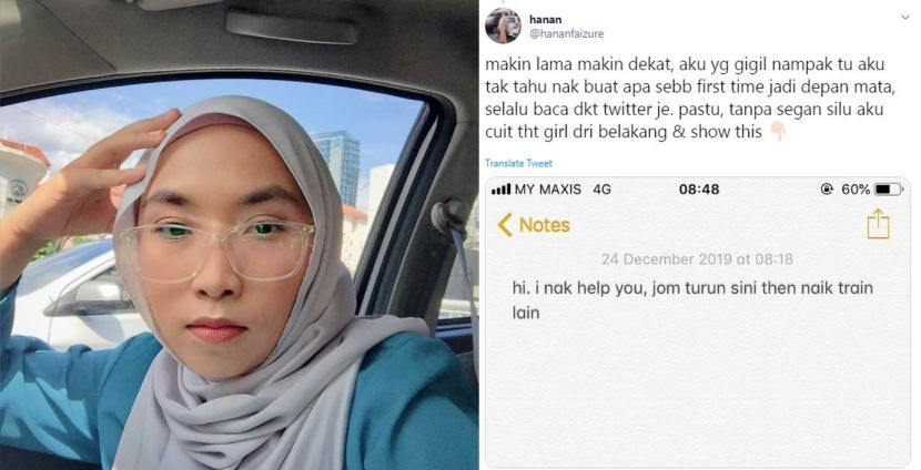"Tanpa segan silu, saya cuit perempuan tu dari belakang dan saya tunjuk phone saya dekat dia yang tertera teks, 'Hi, saya nak tolong awak. Jom turun sini then naik train lain'.