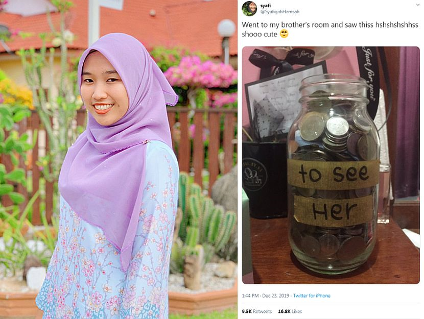 "Bila saya masuk bilik abang saya, saya ternampak satu balang berisi penuh duit syiling. Rupa-rupanya tu tabung. Dan saya nampak siap ada tulis 'to see her' kat badan tabung tu.