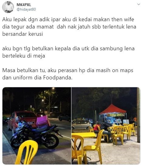 Demikian cerita seorang pemuda berhubung perkongsiannya di laman Twitter dengan memuat naik dua keping gambar seorang rider sebuah syarikat penghantaran makanan yang tertidur di meja makan sewaktu menunggu pesanan.