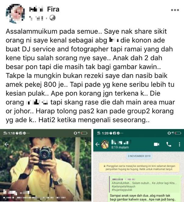 Perkongsian Fira di Facebook mengenai kisahnya ditipu seorang jurufoto.