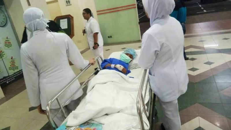 Alif ketika diusung keluar selepas selesai menjalani pembedahan memotong tangan sebelah kiri.