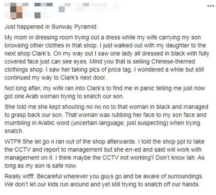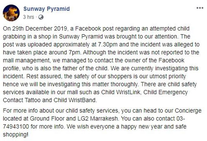 Sementara itu, Sunway Pyramid menerusi halaman Facebooknya pada petang Isnin tampil memberi kenyataan berhubung insiden cubaan culik tersebut.