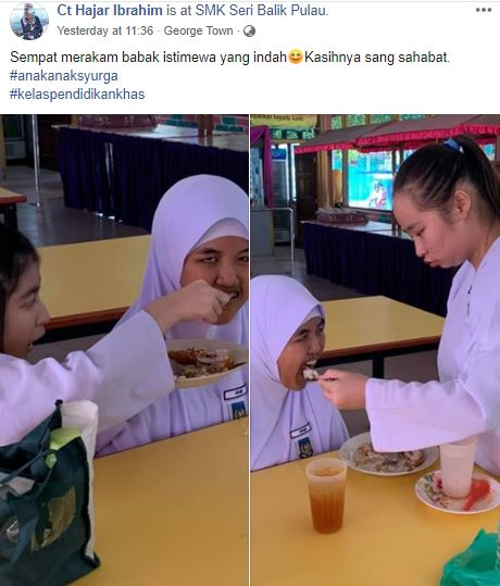 Menerusi perkongsian seorang pengguna Facebook, Ct Hajar Ibrahim, dia sempat merakamkan detik meruntun hati yang mana dua pelajar menyuapkan makanan ke mulut seorang rakan mereka yang merupakan ‘anak syurga’.