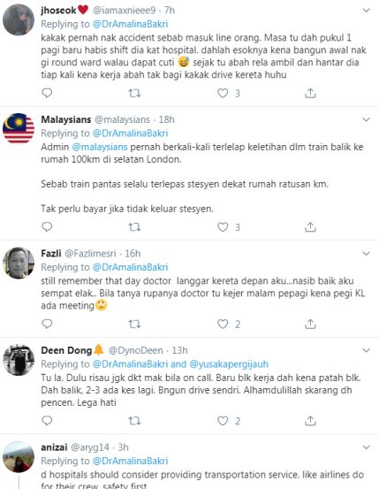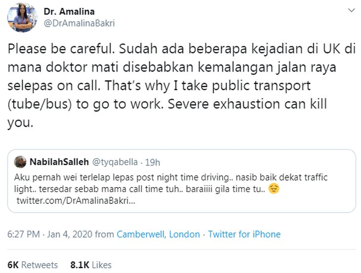 "Tolong berhati-hati. Sudah ada beberapa kejadian di UK di mana doktor mati disebabkan kemalangan jalan raya selepas on call.