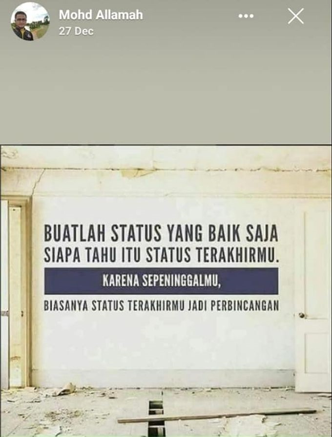 “Buatlah status yang baik saja, siapa tahu itu status terakhirmu. Kerana sepeninggalanmu, biasanya status terakhirmu jadi perbincangan,” menurut perkongsian terakhir di aplikasi Instagram (IG) Story imam berusia 32 tahun itu pada 27 Disember 2019.