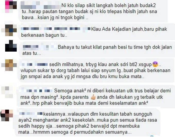 “Kalau silap sikit langkah boleh jatuh budak-budak tu. Harap pautan tangan budak saja ni. Kalau terlepas habislah jatuh bawah. Kasihan tengok begini,” tulis seorang netizen.