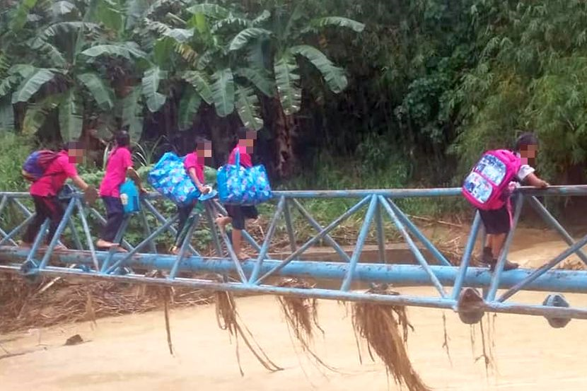“Beginilah keadaan jalan di Kampung Muhang kalau hujan lebat. Anak-anak kami yang balik dari sekolah terpaksa jalan di batang paip. Kasihan kan,” menerusi perkongsian Evyline Lynz Blacklynz di halaman Facebooknya pada Jumaat sehingga tular.