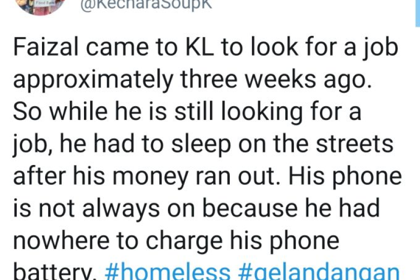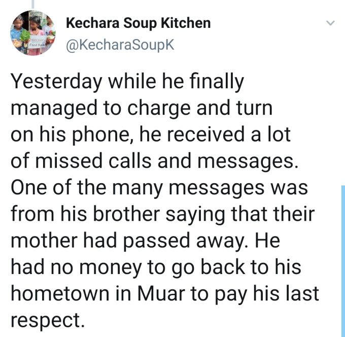 “Salah satu daripada mesej yang banyak itu dihantar abangnya yang mengatakan ibunya telah meninggal dunia,” menurut perkongsian di laman Twitter sebuah badan bukan kerajaan (NGO), Kechara Soup Kitchen pada Ahad.