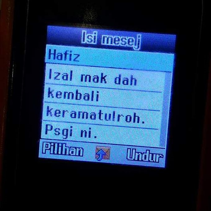 Mesej yang dihantar abangnya bernama Hafiz berbunyi: “Izal, mak dah kembali ke rahmatullah pagi ini”