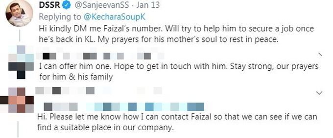 “Mohon DM (mesej secara langsung) saya nombor Faizal. Akan cuba membantunya untuk mendapatkan pekerjaan sebaik sahaja dia kembali ke KL. Doa saya agar roh arwah ibunya tenang di sana,” tulis Sanjeevan.