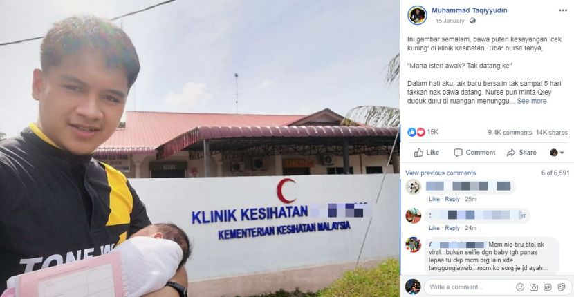 Menerusi posting di Facebook, jejaka berusia 23 tahun itu berkongsi cerita mengenai kunjungannya ke sebuah klinik di Ulu Tiram, Johor, empat hari selepas kelahiran bayi itu untuk pemeriksaan demam kuning.