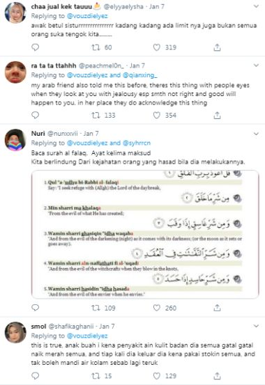 "Lepas tu mak saya bawa pergi jumpa ustazah. Ustazah beritahu saya terkena penyakit 'ain' (mata). Jadi dia minta saya kurangkan main media sosial.