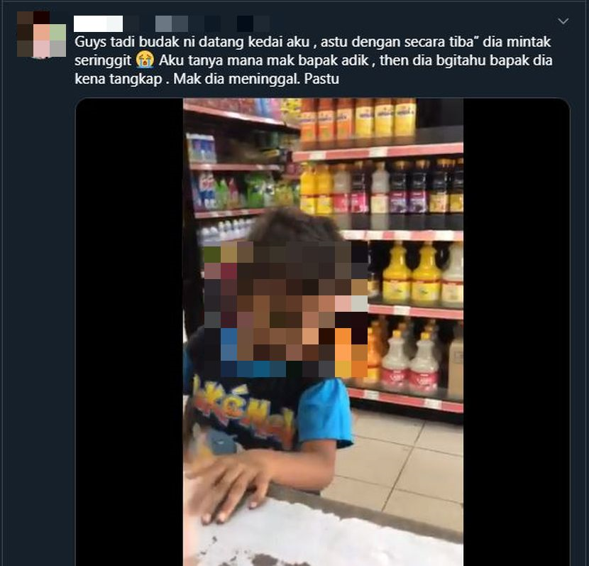 "Saya rasa pelik dan tanya mengenai mak ayah. Dia kata bapa dah kena tangkap, mak pula dah meninggal. Saya kata Ya Allah kesiannya. Saya bagi RM1 dan dia terus berlari keluar.