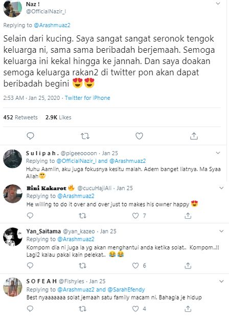 Posting tersebut yang pada asalnya dibuat sekadar suka-suka untuk berkongsi gelagat kucing peliharaan yang dianggap luar biasa, tanpa disangka mengundang komen netizen yang tertarik melihat aktiviti solat berjemaah keluarga berkenaan.