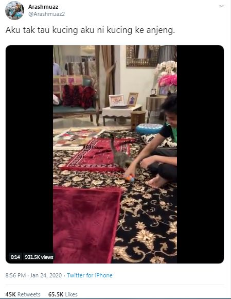 Menurut remaja yang memuatnaik video tersebut di Twitter, Arash Muaz, dia berkongsi video gelagat kucing peliharaan yang berkelakuan seperti seekor anjing kerana merasakan ia sesuatu yang pelik dan lucu.