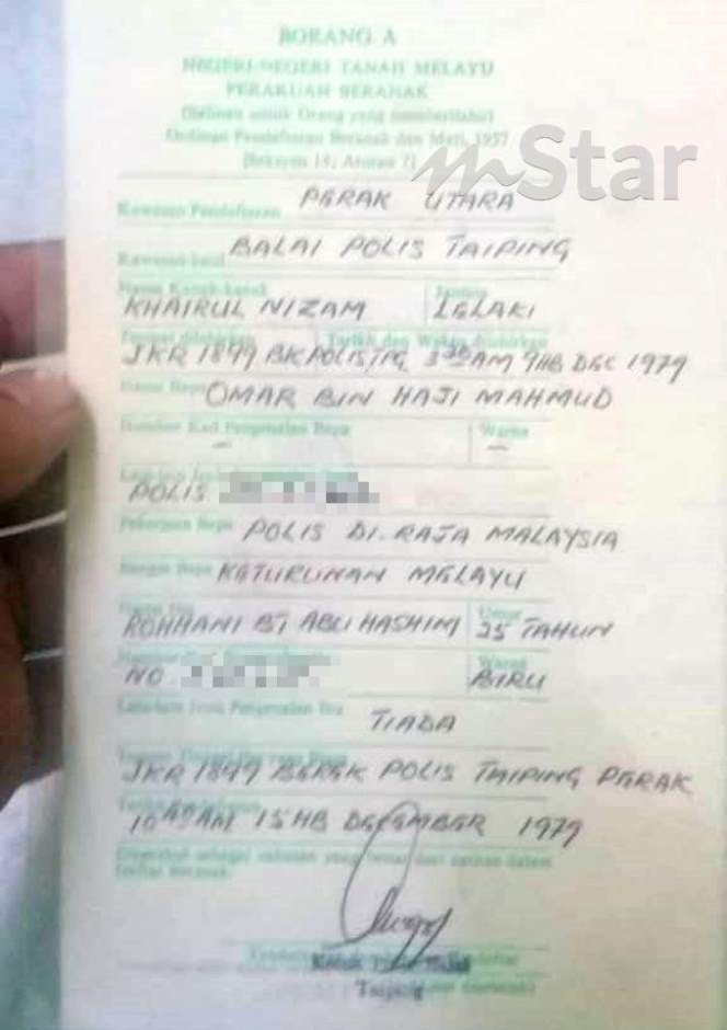 Sijil kelahiran yang didakwa Khairul Nizam 'dipalsukan' oleh bapanya dengan bantuan rakan.