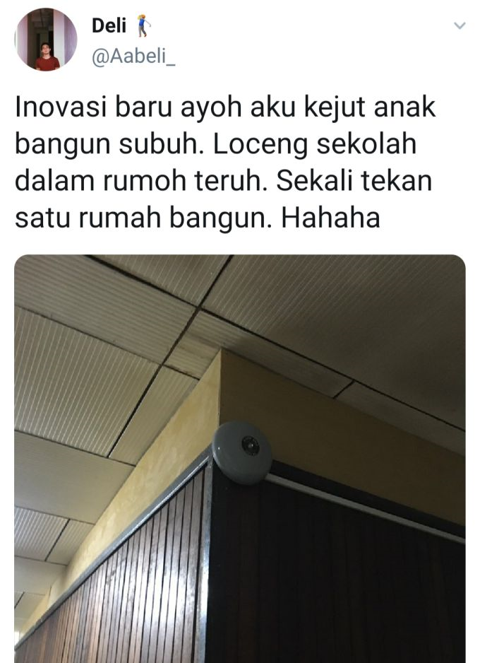 “Inovasi baharu ayah aku kejut anak bangun Subuh. Loceng sekolah dalam rumah terus, sekali tekan satu rumah bangun,” menurut posting seorang pemuda yang tular.