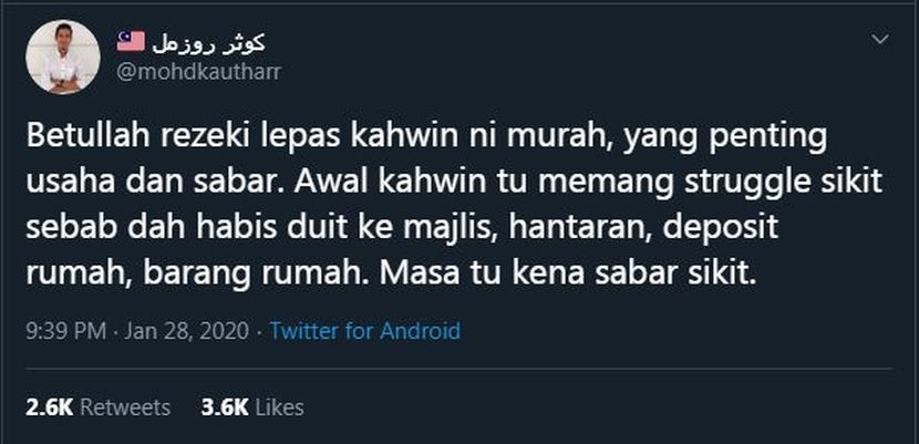 "Saya suka nak kongsi pengalaman. Saya pun baru kahwin pada Oktober lalu. Biasalah untuk lelaki, masa nak kahwin habis banyak duit.
