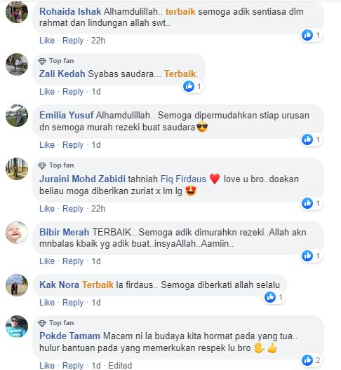 Antara komen netizen yang memuji tindakan mulia Mohd Firdaus.