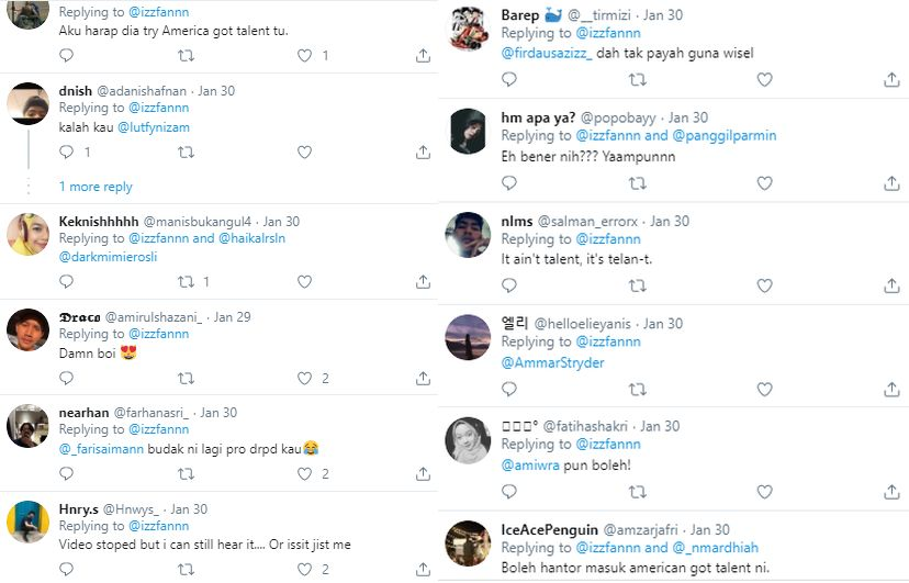“AKU harap dia try America's Got Talent” Demikian komen netizen yang meluahkan rasa kagum melihat bakat seorang remaja lelaki yang mampu melantunkan bunyi umpama alat muzik rekoder. Dalam video berdurasi 18 saat yang dikongsikan seorang pengguna Twitter bernama Izzfan, seorang remaja lelaki menggunakan suaranya melantunkan bunyi siulan lagu tema filem Titanic, My Heart Will Go On nyanyian Celine Dion. ARTIKEL BERKAITAN: “Sampin ayahnya dipotong, nasib yang lama punya” - Budak 9 tahun lipat tanjak macam pro lepas tonton Upin Ipin ARTIKEL BERKAITAN: Cipta model jentera guna kertas, bahan terbuang... bakat remaja ini buat ramai terpana! Perkongsian itu menjadi tular di laman sosial tersebut di mana sehingga kini ia meraih 29,500 retweet selain dibanjiri komen netizen yang memuji bakat remaja lelaki berkenaan. “Talented boy. Boleh cover banyak lagi lagu rekoder,” komen seorang pelayar. “Sebiji macam bunyi main rekoder,” komen netizen lain pula. Video yang dimuat naik oleh seorang pelayar Twitter mengenai bakat seorang remaja lelaki menjadi tular. Berkongsi cerita dengan mStar, abang kepada pelajar lelaki berkenaan, Muhammad Jeffrey Mhd Nasir berkata adiknya yang hanya mahu dikenali sebagai Wan dikesan mempunyai kebolehan demikian sejak berusia 10 tahun. “Saya perasan dia selalu menonton video Funny Memes Compilations di YouTube sejak usianya 10 tahun. Tak tahulah nak kata ia bakat tersembunyi atau kebolehan, tapi dia memang suka tengok YouTube terutama video memes. “Ia kedengaran seakan-akan rekoder mungkin disebabkan suaranya masih lagi belum bertukar seperti suara orang dewasa sebab dia baru berusia 13 tahun,” katanya sambil menambah, dia sama sekali tidak menyangka video tersebut menjadi tular di laman sosial. Muhammad Jeffrey, abang kepada remaja lelaki berbakat bernama Wan turut tidak menyangka bakat adiknya mendapat perhatian netizen. Menurutnya, video tersebut dirakam dan dimuat naik oleh seorang pelajar tingkatan lima di sekolah yang sama dengan adiknya. Kata Jeffrey, ironinya, adik bongsunya itu tidak mempunyai kemahiran bermain sebarang alat muzik. Tak tahulah nak kata ia bakat tersembunyi atau kebolehan, tapi dia memang suka tengok YouTube terutama video memes. MUHAMMAD JEFFREY MHD NASIR ABANG “Nak kata dia pandai bermain alat muzik, saya rasa tidak. Rekoder pun dia tak pandai tiup. Tapi dia ada bakat melukis khususnya watak anime. “Dia boleh melukis menggunakan kertas dan satu perisian di dalam komputer,” kata pemuda berusia 21 tahun itu. Di sebalik kebanyakan komen positif yang diterima susulan tularnya video tersebut, Muhammad Jeffrey turut meluahkan rasa kesalnya dengan segelintir netizen yang tanpa rasa bersalah melontarkan komen negatif berbaur hinaan terhadap adiknya. Selain bersiul seperti rekoder, Wan juga berbakat melukis kartun anime. “Ada beberapa netizen yang menulis komen bukan-bukan susulan video tersebut turut viral di Instagram. Ada yang mempersoalkan tentang adik saya. Saya sudah menulis mesej kepada pengendali akaun tersebut untuk memadam video adik yang dimuat naik di akaun mereka. “Saya bimbang komen-komen ini mempengaruhi adik sebab sebelum ini dia pernah dibuli di sekolahnya. Dia tahu videonya viral dan komen-komen negatif yang dilontarkan kepadanya. Dia agak sedih juga, tapi saya beritahu, tak perlu layan komen-komen seperti ini. Biarkan mereka bercakap, kita buat hal sendiri sahaja,” katanya yang berasal dari Ampang, Selangor. Antara komen netizen yang melahirkan rasa kagum dengan bakat Wan. Dalam masa yang sama, Jeffrey meminta netizen berhenti melontarkan komen-komen negatif terhadap seseorang, khususnya melibatkan penampilan diri seseorang. “Video itu hanyalah untuk tujuan suka-suka sahaja. Langsung tak ada niat nak cari perhatian atau nak jadi terkenal. “Jadi tak perlu nak beri komen-komen negatif, lagipun komen sedemikian langsung tak memberi faedah bahkan boleh mencetuskan situasi yang tidak elok, khususnya kepada individu dalam video itu,” ujarnya mengakhiri bicara. View this post on Instagram Siapa pernah main rekoder dekat sekolah dulu? Sebijik kan bunyi dia! #mstarkongsi #mstarSH A post shared by mStar (@mstaronlineofficial) on Feb 1, 2020 at 7:00pm PST