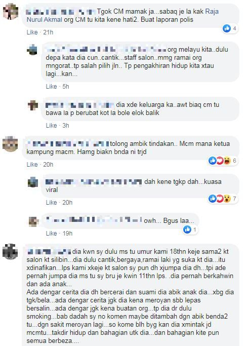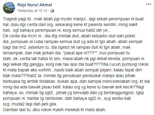 “DULU dengar cerita daripada orang.... sekarang terkena dekat parents sendiri” Demikian perkongsian seorang wanita mengenai kejadian yang menimpa bapanya, gara-gara 'diserang' seorang individu yang didakwa mengalami masalah mental. Menerusi perkongsian Raja Nurul Akmal di Facebook miliknya, kejadian berlaku pada pagi Sabtu, ketika kedua ibu bapanya keluar ke Manjoi, Ipoh untuk membeli barang di sebuah pasaraya di pekan berkenaan. ARTIKEL BERKAITAN: “Saya pernah lihat dia pandu kereta” - Siang makcik jual tisu di Tesco, berlakon jadi orang susah... malam pergi karaoke! ARTIKEL BERKAITAN: Wanita kena scam dengan budak lelaki di KLCC, duit RM67 ‘hangus’ – “Dia cakap anak tunggal, mak ayah dah bercerai” Ketika itu, bapanya didatangi oleh seorang wanita yang meminta wang. “Abah keluarkan duit daripada poket... perempuan ni cuba rampas semua duit yang ada di tangan abah. Abah sempat bagi dia RM2. “Mak ternampak dan mak jerkah dia 'pasal apa ni?'. Terus perempuan itu blah,” tulisnya pada perkongsian tersebut. Posting yang dikongsikan seorang wanita mengenai kisah bapanya 'diserang' individu didakwa mengalami masalah mental. Tambah Raja Nurul Akmal, 'serangan' terhadap bapanya tidak terhenti di situ, apabila wanita yang sama sekali lagi menghampiri bapanya, namun kali ini dia bersikap lebih agresif. “Masa abah nak pergi dekat kereta, perempuan ni lagi sekali datang ganggu. Korang nak tahu apa dia buat? Dia cucuh puntung rokok dekat mata bapak aku. Nasib baik abah sempat pejam. Kalau tepat dalam bijik mata?” luahnya dalam nada geram. Ujarnya, dia bimbang perkara yang tidak diingini berlaku memandangkan sudah banyak mendengar cerita mengenai sikap agresif wanita tersebut yang sering meminta wang daripada orang ramai di sekitar pekan Manjoi. Wanita yang dikenali sebagai Fatihah didakwa sering merayau di pekan Manjoi dan meminta duit daripada orang awam. “Bukan apa, dah sampai mencederakan orang. Jadi minta tolong sangat-sangat kepada pihak berwajb dan pihak yang bertanggungjawab,” tulisnya. Perkongsian tersebut sehingga kini meraih 7,400 share dan dihujani ratusan komen netizen. Ada di antara mereka mendedahkan wanita tersebut yang dikenali sebagai Fatihah, mengalami masalah mental gara-gara tekanan yang dialami selepas bercerai. Masa abah nak pergi dekat kereta, perempuan ni lagi sekali datang ganggu. Korang nak tahu apa dia buat? Dia cucuh puntung rokok dekat mata bapak aku. Nasib baik abah sempat pejam. RAJA NURUL AKMAL ANAK “Ada dengar cerita dia dah bercerai dan suami dia ambik anak dia tak bagi dia jenguk dan pelihara. Ada kata dia meroyan lepas bersalin. Ada dengar jugak dia kena buatan orang,” komen seorang netizen. Namun ada mendakwa wanita tersebut berubah 'kurang siuman' gara-gara mengambil bahan terlarang. “Dulu depa (mereka) kata dia cun, cantik dan seorang staf salon. Memang ramai orang mengorat. Tapi salah pilih jalan... pengakhiran hidup kita tak tahu lagi kan,” komen netizen yang lain. Antara komen netizen terhadap perkongsian Raja Nurul Akmal. Bagaimanapun menerusi posting terbaharu oleh Raja Nurul Akmal, dia mengatakan wanita tersebut kini sudah ditahan dan dibawa ke Hospital Tanjung Rambutan untuk menerima rawatan. “Alhamdulillah. Semoga kebajikan dia terjaga di sana.. Takdalah membahayakan orang sekeliling,” tulis seorang netizen. “Elok lah macam tu. Kalau dibiarkan tak tahu lah apa akan jadi,” komen netizen yang lain pula.
