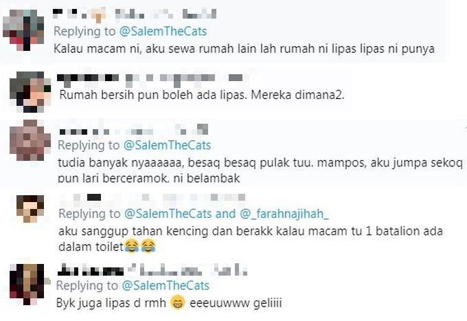 “Saya amat terkejut sebab bagi saya dua ekor pun dah banyak inikan lima ekor entah datang dari mana. Saya bergegas ke tandas nak tengok, saya buka pintu sipi-sipi saja sebab takut sangat.