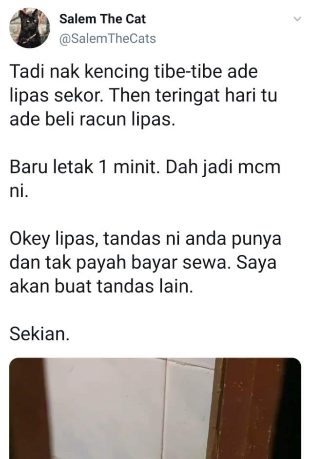 “Tadi nak kencing tiba-tiba ada seekor lipas. Kemudian teringat hari tu ada beli racun lipas. Baru letak satu minit dah jadi macam ni. Okay lipas, tandas ni anda punya dan tak payah bayar sewa. Saya akan buat tandas lain,” tulisnya di laman sosial dengan memuat naik video menunjukkan sekumpulan lipas ‘menyerbu’ serbuk racun yang diletakkannya di tandas.