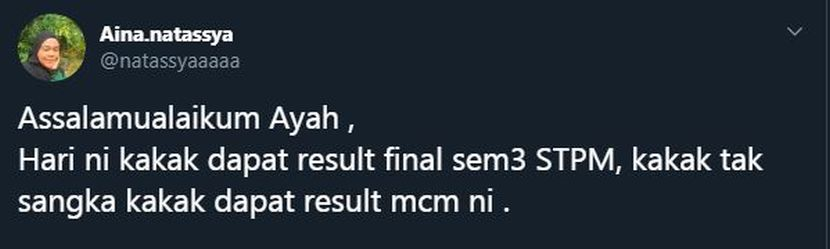 "ASSALAMUALAIKUM ayah. Kakak tak sangka dapat result macam ni."