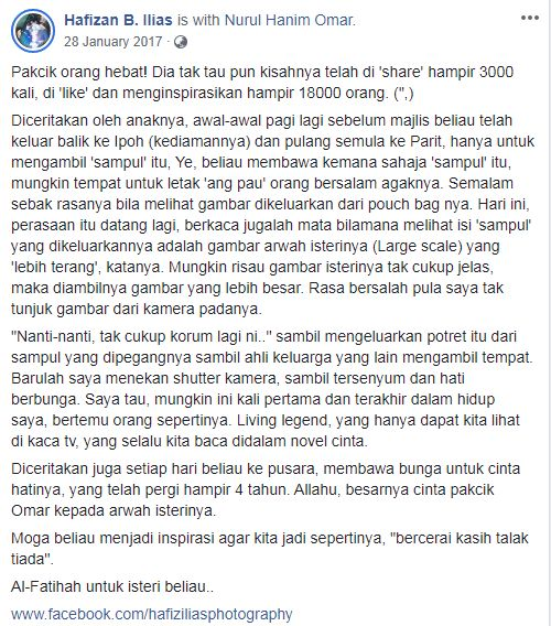 Hafizan berkata, dia kemudian memutuskan untuk membuat perkongsian yang kedua kerana tersentuh menyaksikan momen indah itu sekali lagi, di mana posting itu meraih sehingga 17,000 shares.