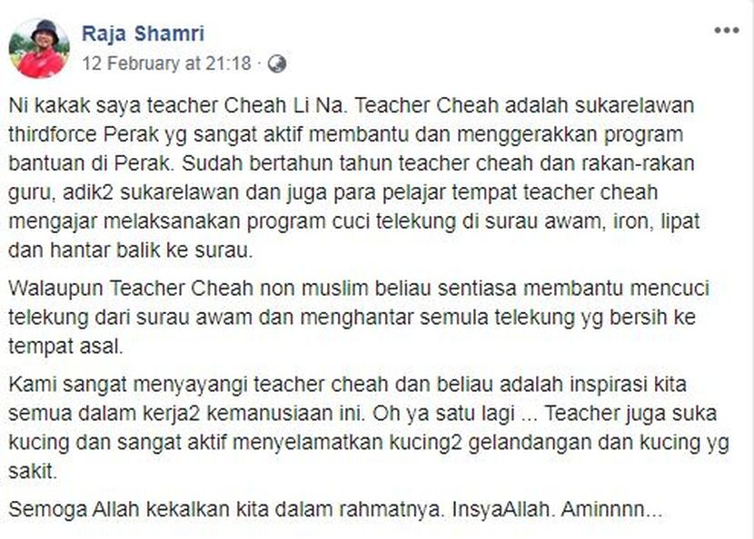 Cheah Li Na, 60, pensyarah bahasa Inggeris yang juga Ketua Unit Pusat Sumber Kolej Vokasional Seri Manjung (KVSM), Perak bagaimanapun mengakui segan apabila namanya menjadi sebutan gara-gara satu posting tular di Facebook.