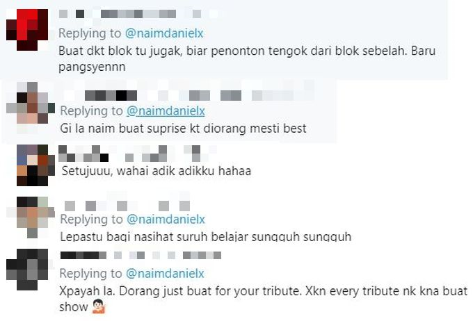 “Tak payahlah. Mereka hanya buat (menyanyi) untuk tribute (penghormatan) kamu. Takkan setiap tribute nak kena buat show,” komen seorang netizen.