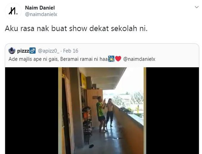 “Aku rasa nak buat show di sekolah ni,” tulisnya menerusi posting di laman Twitter @naimdanielx yang diulang kicau lebih 5,800 kali dan meraih lebih 17,000 tanda suka (like).