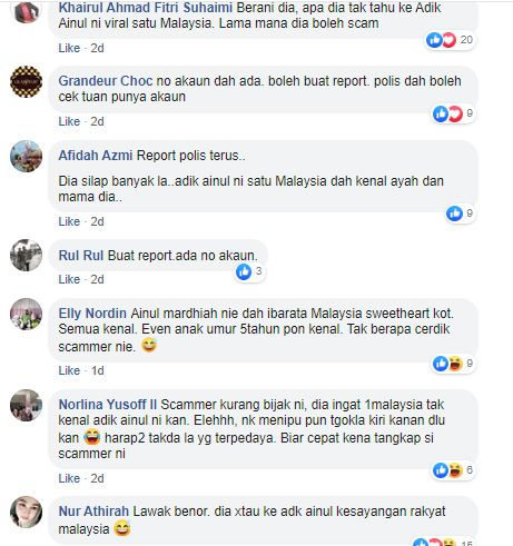 “Berani dia, apa dia tak tahu ke Adik Ainul ni viral satu Malaysia. Lama mana dia boleh scam,” komen seorang netizen.