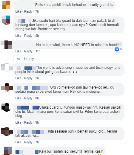 “Walau apa pun pengawal keselamatan tak ada hak pukul dia. Panggil polis lah kalau serius,” tulis netizen lain pula.